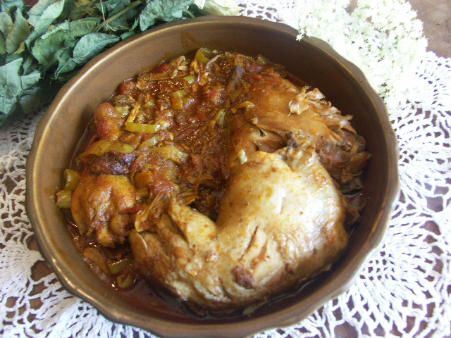 Použité suroviny: 4 kuřecí stehna, 1 cibule, 2 zelené papriky, 2 rajčata, 3 stroužky česneku, ...