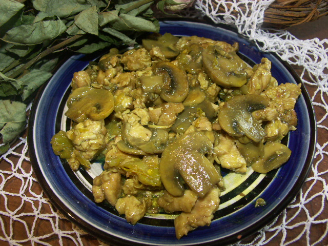 Použité suroviny: 50 dkg kuřecího masa, 20 dkg žampiónů, 1 paprika, kousek celeru, 1 lžička ...